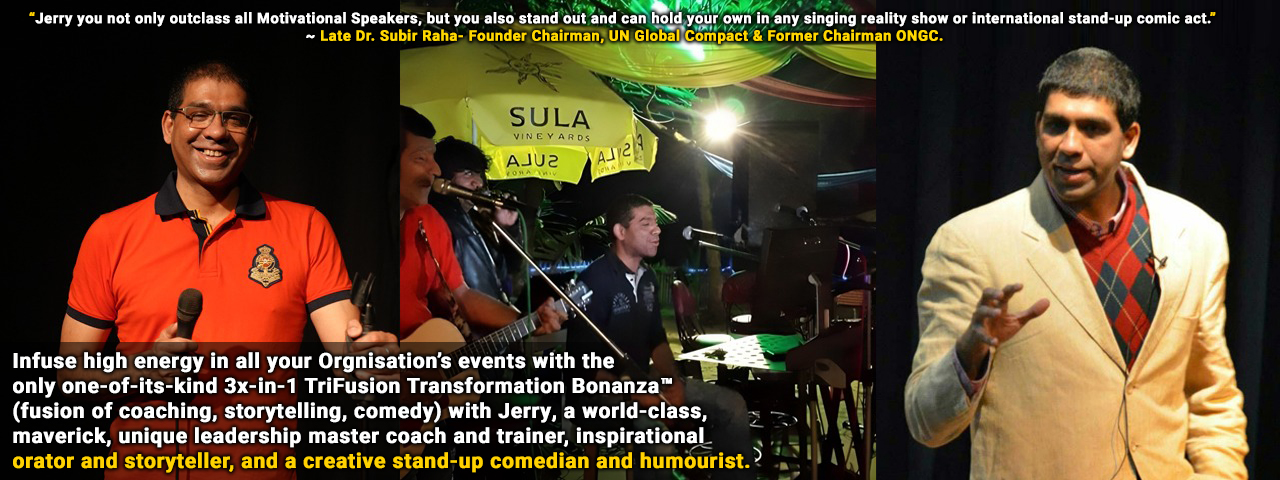 Presenting Jerry’s 3x-in-1 TriFusion Transformation Bonanza™ (The only leadership coach and professional speaker around the world who compellingly, successfully and effectively delivers consulting for visioning and strategic planning, leadership training, powerful oratory, inspirational storytelling and creative customised comedy to bend with your event theme.)